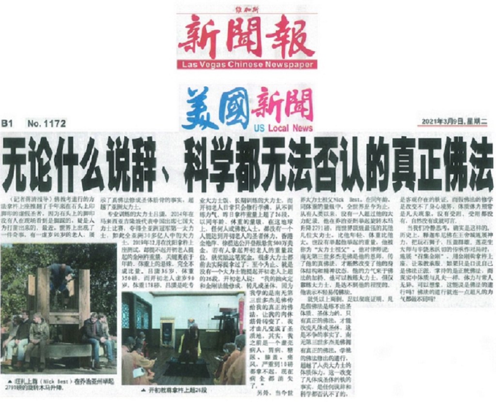 另外,當今世界大力士祖父Nick Best,在同年齡、同體重的量級中,全世界至今為止,從有人類以來,沒有一人超過他的大力紀錄。他在喬治亞州舉起旋轉木馬升降2791磅,而世界頂級最強的其他幾位大力士,比他年輕、體重比他大,也沒有舉起他舉起的重量,他被稱為“大力士祖父”。他對律師說:南無第三世多杰羌佛是他的恩師,傳了他的真佛法,才斷然改變了他的身體結構和精神狀態,他的力氣來於佛法的加持。他可以教練大力士,但僅靠練大力士,是達不到他的程度的。他表示不輕易傳佛法。